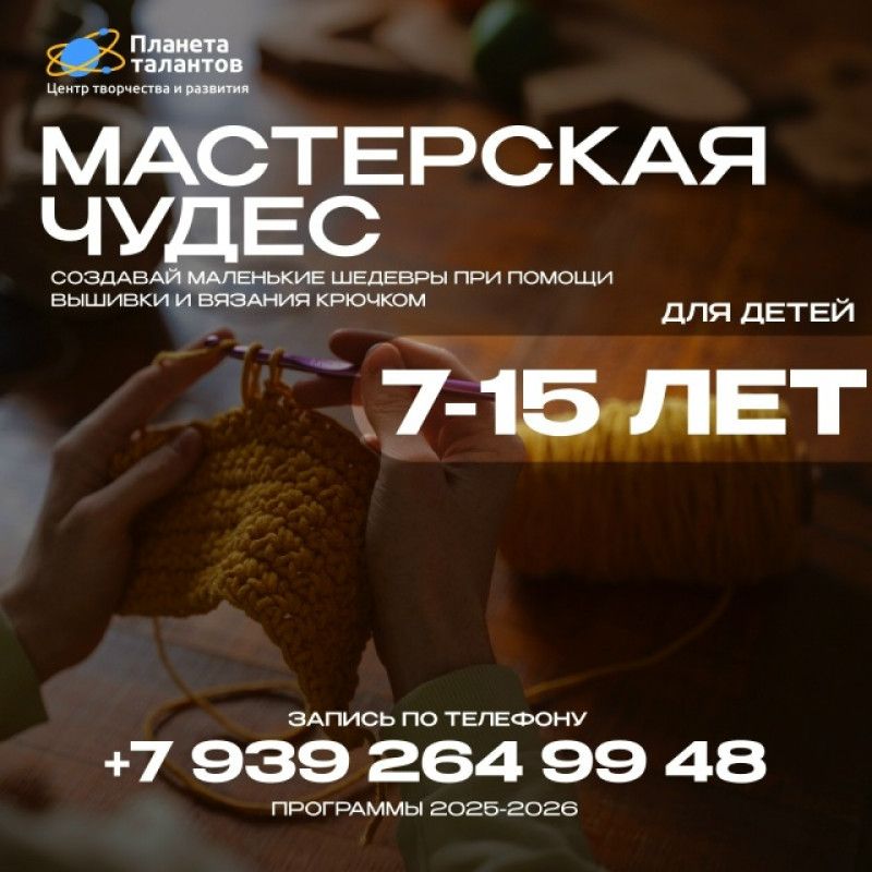 Создавай маленькие шедевры при помощи вышивки и вязания крючком на программе «Мастерская чудес»🧶 Вышивка и вязание будет очень полезна для всех возрастов. Она даст возможность творческого развития и воображения, развития мелкой моторики и концентрации внимания. ✨ На занятиях ты сможешь: ✅Освоить базовые и продвинутые техники вышивки и вязания крючком ✅Развить творческое мышление и моторику ✅Создать подарки своими руками для семьи и друзей ✅Погрузиться в атмосферу творчества и вдохновения 🧒🏼👧🏻Возраст: 7-15 лет ⏲Срок обучения: 1 год 👩🏻Педагог: Смердева Надежда Викторовна Запись на программу: 🗒 через Госуслуги 👩🏼‍💻через Навигатор: navigator.krao.ru 🌐на нашем сайте: ​планетаталантов.рф/zapisatsya... 📲8-939-264-99-48 или по адресу м-он 5, 14 Открой мир рукоделия, где каждая нить рассказывает свою историю! ⭐