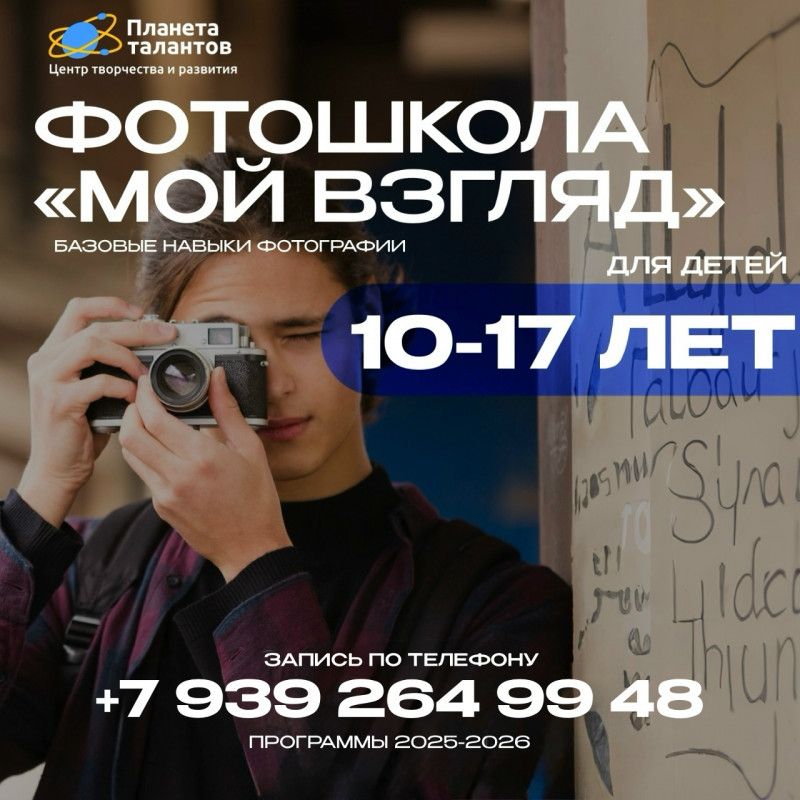 Хочешь научиться фотографировать не хуже профессионалов?! Тогда срочно записывайся в нашу фотошколу «Мой взгляд»! ✨ На занятиях тебя ждут: ✅Увлекательные мастер-классы от профессиональных фотографов; ✅Фотолаборатории; ✅Фотоквесты; И много-много практики. 👧🏼👦🏻 Возраст: 10-17лет 🕒 Срок обучения: 1 год 👩🏼Педагог: Клыкова Ирина Игоревна Запись на программу: 🗒 через Госуслуги 👩🏼💻через Навигатор: navigator.krao.ru 🌐на нашем сайте: планетаталантов.рф/zapisatsya... 📲8-939-264-99-48 или по адресу м-он 5, 14 Приходите и начинайте свое путешествие в мир фотографии вместе с нами!