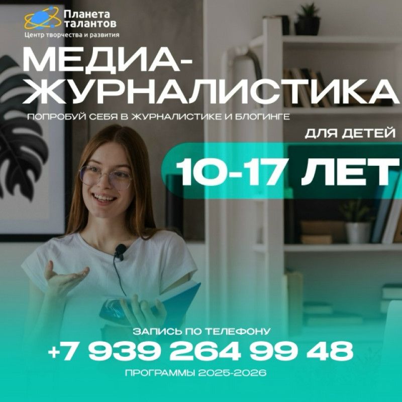 Получи основательные знания о работе журналиста,автора статей и блогера на новой программе Планеты «МЕДИАЖУРНАЛИСТИКА» На занятиях будет: ✅ Практическое освоение современных цифровых инструментов: работа с искусственным интеллектом, текстом, фото и видеоматериалами. ✅ Развитие коммуникативных навыков и умения интервьюирования. ✅ Создание собственного медиаконтента: статьи, блоги, видеоролики. ✅ Регулярные мастер-классы от профессиональных журналистов и медийщиков. 👧🏼👦🏻 Возраст: 10-17лет 🕒 Срок обучения: 1 год 👩🏫 Педагог: Клыкова Ирина Игоревна Раскрой свой творческий потенциал и приобрети профессиональные навыки в области медиа! Запись на программу: 🗒 через Госуслуги 👩🏼💻через Навигатор: navigator.krao.ru 🌐на нашем сайте: планетаталантов.рф/zapisatsya... 📲8-939-264-99-48 или по адресу м-он 5, 14