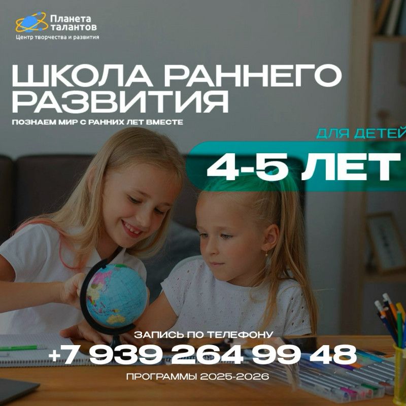 Записывайтесь на программу «Школа раннего развития» для детей 4-5 лет. Программа направлена на всестороннее развитие личности ребенка, его познавательных способностей, ценностных представлений об окружающем мире, кругозора, интеллекта, личностных качеств посредством включения его в различные виды деятельности.💫 👧🏼👦🏻 Возраст: 4-5 лет 🕒 Срок обучения: 1 год 👩🏫 Педагог: Погонченкова Мария Александровна Начни познавать мир вместе с нами!🌍 Запись на программу: 🗒 через Госуслуги 👩🏼💻через Навигатор: navigator.krao.ru 🌐на нашем сайте: планетаталантов.рф/zapisatsya... 📲+7-939-264-99-48 или по адресу м-он 5, 14